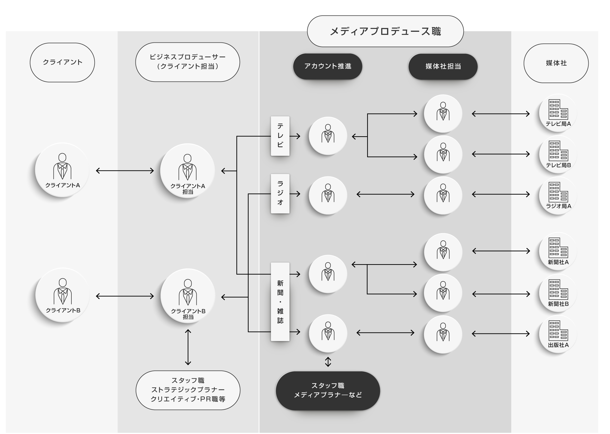各クライアントを担当するビジネスプロデューサーからメディアプロデューサーを通じて媒体社へと業務が流れます。